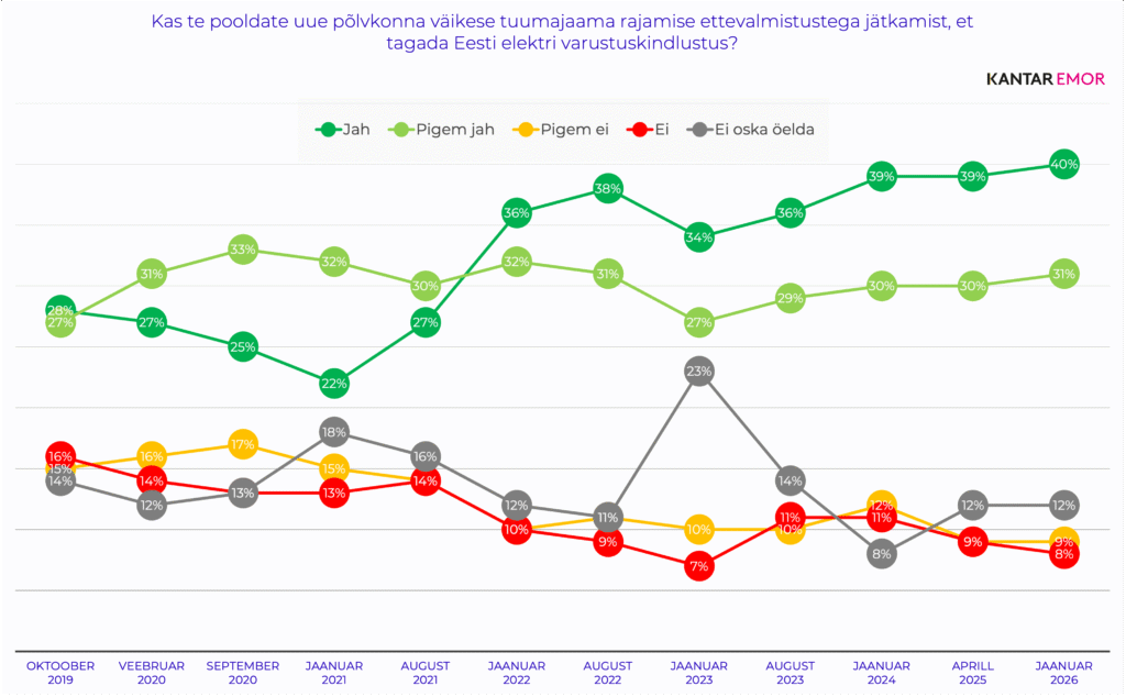 Jaanuaris Kantar Emori läbi viidud uuringust selgub, et uue põlvkonna tuumajaama rajamise ettevalmistustega jätkamist toetab või pigem toetab 71% vastanuist. Võrreldes eelmise, 2025. aasta aprillis tehtud uuringuga on toetus tuumaenergia kasutuselevõtule kasvanud ning on nüüd kõrgeim kogu uuringuperioodi vaates alates 2019. aastast. Samal ajal on tuumaenergia vastaste osakaal jätkanud langustrendi. Värske uuringu kohaselt on tuumaenergia arendamise vastu 17% vastanuist, seejuures pea võrdselt nii „kindlaid“ (8%) kui „pigem“ (9%) vastaseid. Selget seisukohta ei osanud võtta 12% vastanutest.