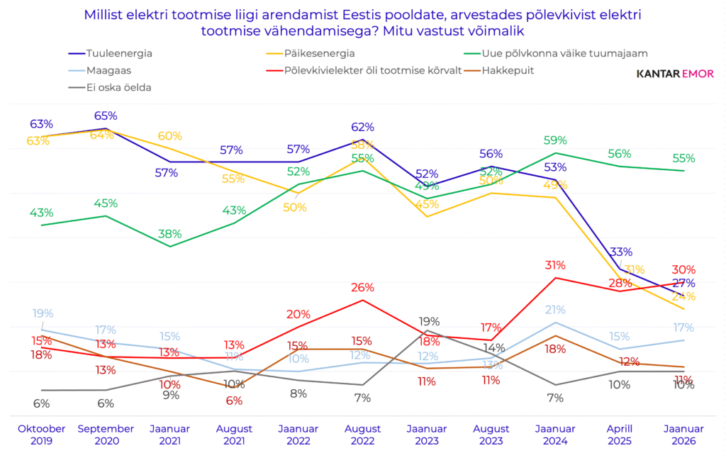 Tuumaenergia on jätkuvalt Eesti inimeste hinnangul eelistatuim elektritootmise arendussuund. Küsimusele „millist elektri tootmise liigi arendamist Eestis pooldate, arvestades põlevkivist elektri tootmise vähendamisega?“ vastas 58% vastanutest, et nende hinnangul väärib Eestis arendamist uue põlvkonna väike tuumajaam. Võrreldes eelmise aastaga on samal ajal märgatavalt langenud nii tuule- kui päikeseenergia populaarsus. Tuuleenergia arendamist pooldab 30% vastanutest ning päikeseenergiat 29%, mis on oluliselt madalam kui aasta tagasi. Seevastu on kasvanud toetus elektri tootmisele põlevkivist õlitootmise kõrvalt, mida peab arendamist väärivaks 32% vastanutest.