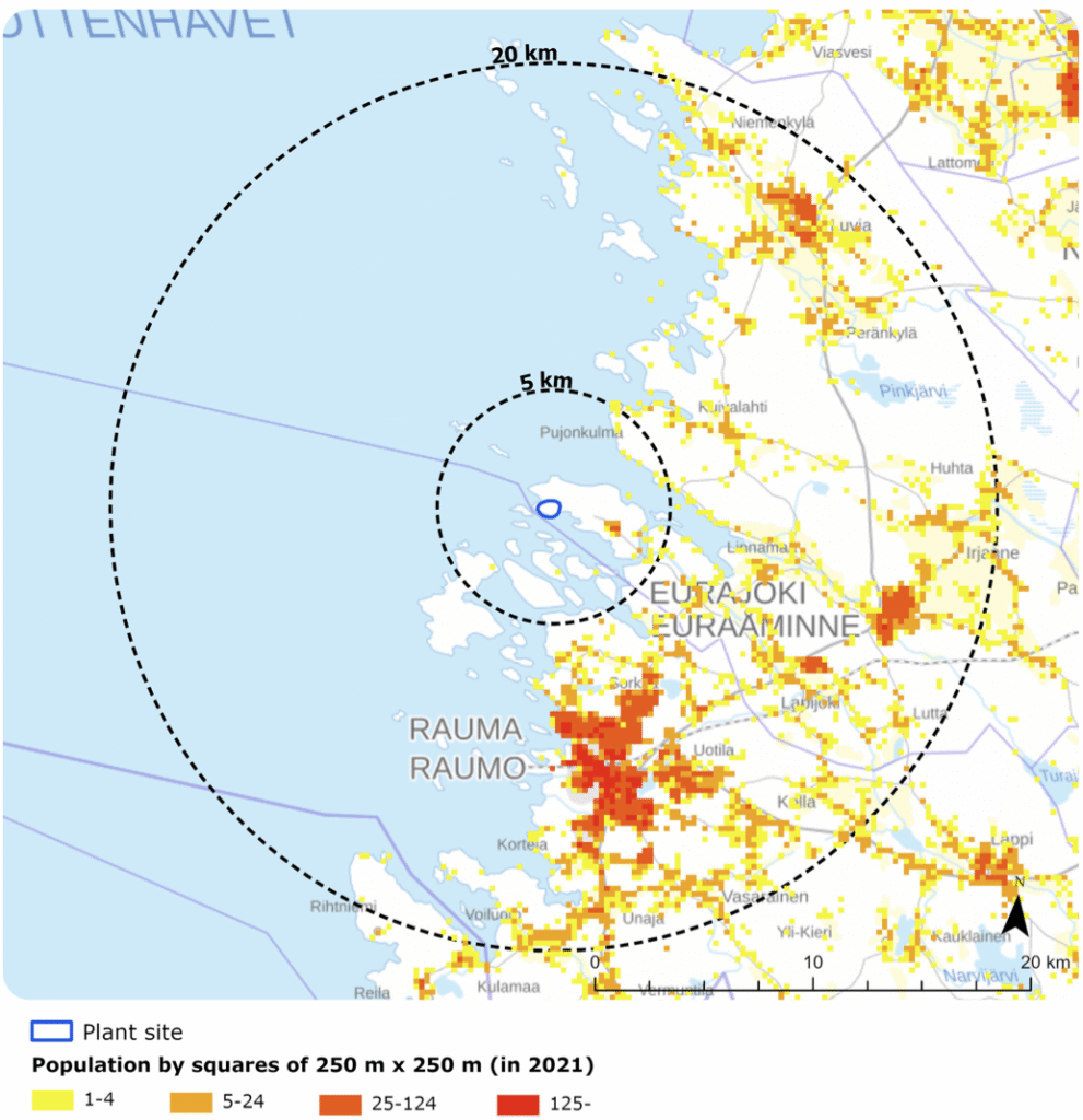 Tuumajaama läheduses on kolm olulist keskust: Eurajoki valla keskus, Rauma linn (39 000 elanikku) ja Pori linn (83 000 elanikku).