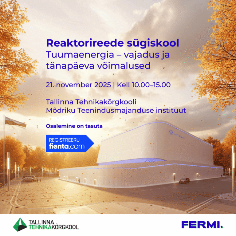 Tallinna Tehnikakõrgkooli Teenusmajanduse instituut koostöös Fermi Energiaga kutsub osalema Reaktorireede sügiskoolis „tuumaenergia – vajadus ja tänapäeva võimalused“, mis toimub reedel, 21. novembril 2025 kell 10.00–15.00 Tallinna Tehnikakõrgkooli Mõdriku Teenusmajanduse instituudis. Sügiskool toob kokku teadlased, tudengid, ettevõtjad ja kohaliku kogukonna, et ühiselt arutleda tuumaenergia rolli üle Eesti energiatulevikus. Päeva jooksul kõnelevad eksperdid energianõudlusest ja elektritootmise struktuurist, taastuvenergia arengutest, tuumaenergia kasutuselevõtu programmist ning selle sotsiaalmajanduslikest ja keskkonnamõjudest. Oodatud on kõik, kes soovivad mõista, millised on Eesti energiasüsteemi tulevikuvalikud ja kuidas tuumaenergia võiks sellesse sobituda. Tule kuulama, arutlema ja kaasa mõtlema! 👉 Registreerimine ja lisainfo: https://fienta.com/et/reaktorireede-tuumaenergia-vajadus-ja-tanapaeva-voimalused